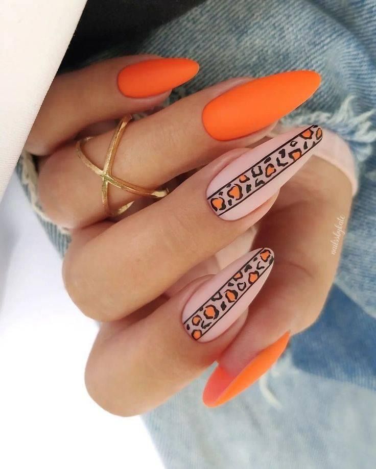 Featuring a sleek orange matte base with bold, black and orange leopard print stripes, this design is perfect for those who like to combine daring colors with an edgy print for a wild and trendy vibe.