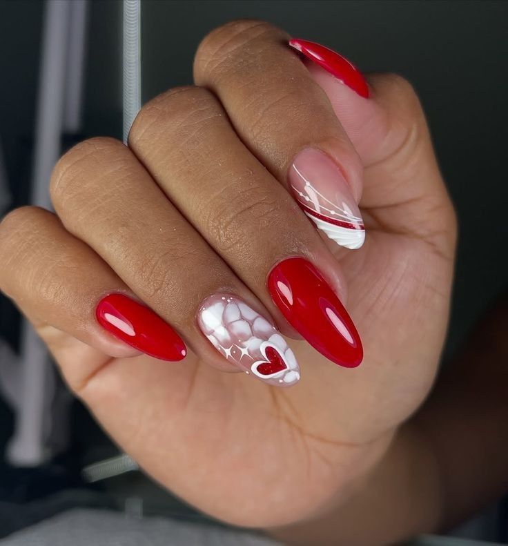 A classic combination of red and white, with delicate swirling details and a hint of sparkle. These nails exude sophistication, making them perfect for chic events and festive occasions.