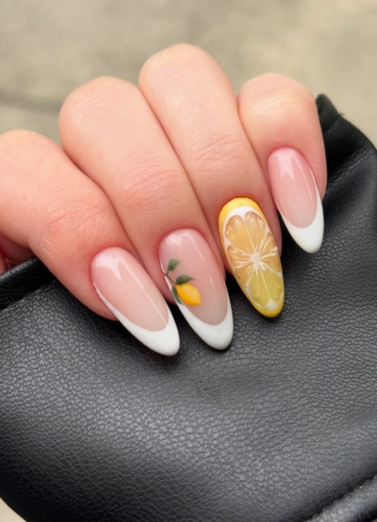 A soft and subtle lemon-inspired design, with one nail featuring a bold, yellow lemon illustration while the others stay classic with a clean French tip. Perfect for a fresh and summery look.