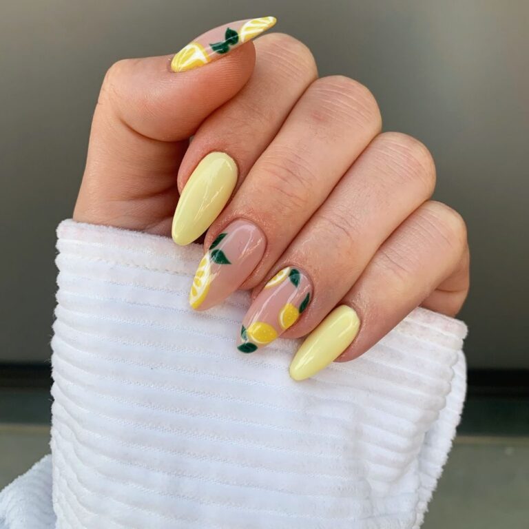 These nails feature a vibrant yellow with green accents and lemon illustrations, creating a fresh, citrus-inspired design that’s perfect for bright, sunny days.