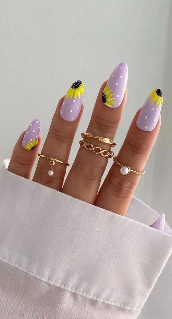Soft lavender nails adorned with sunflower designs and white polka dots. This design combines the beauty of nature with a soothing color palette, perfect for a relaxed, feminine touch.