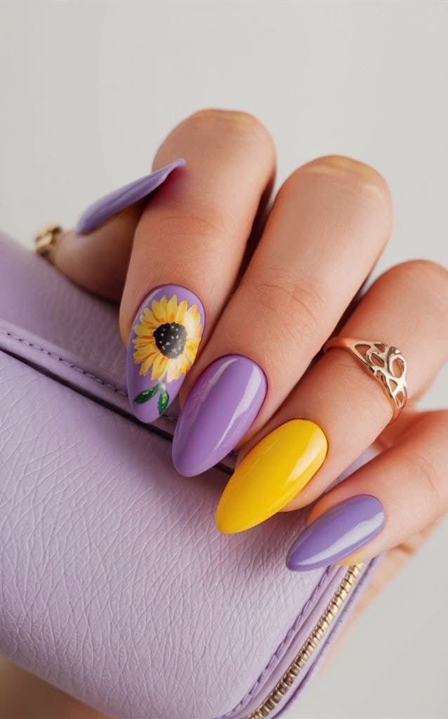 A creative mix of purple and yellow nails with a hand-painted sunflower accent. These colors bring together fun and femininity, ideal for those who love bold color combinations.