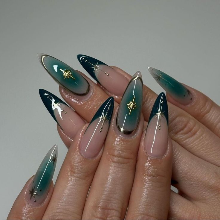 A mystical design with deep teal ombre tips, gold stars, and delicate moon detailing. This design gives a magical and celestial feel, perfect for those who want their nails to stand out with a touch of glamour and cosmic energy.