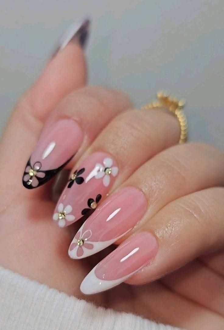 These nails feature a soft nude base, contrasted with black and white floral designs. The minimalist flower accents paired with the almond shape make these nails an excellent choice for a modern and subtle style.