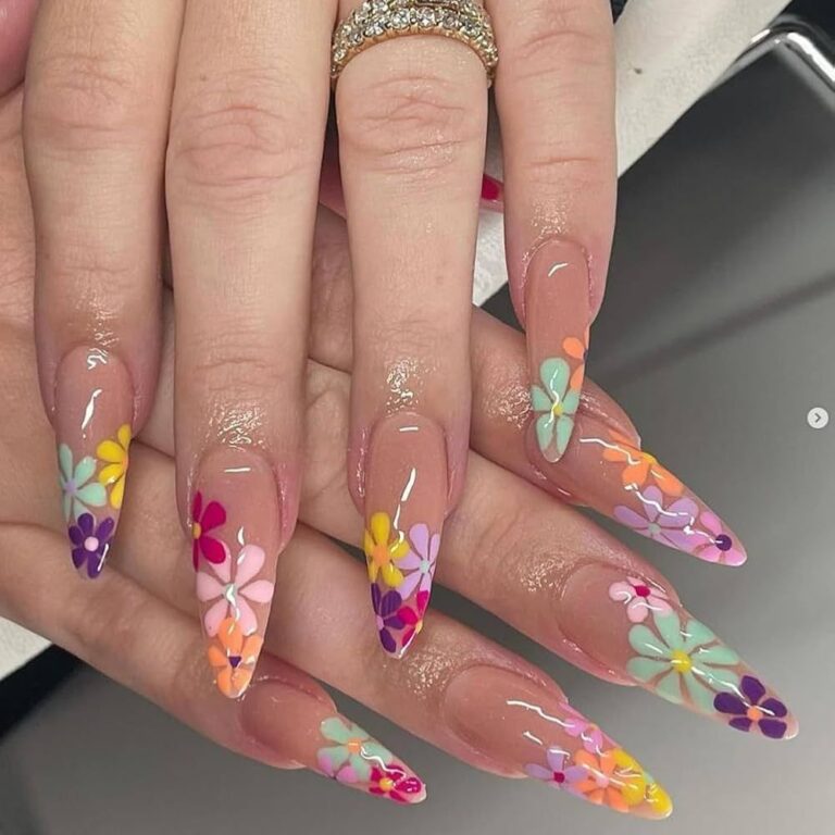 Bright, colorful floral designs adorn these almond-shaped nails, creating a lively and fresh look. Perfect for a fun, spring vibe with a mix of vibrant pastel colors that make the nails stand out.