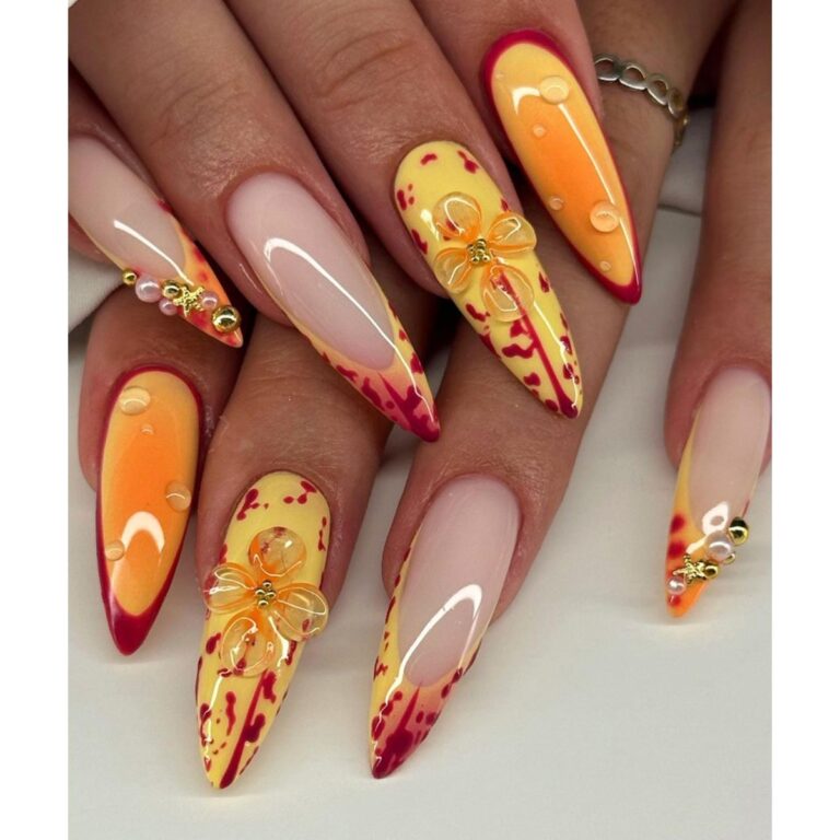 A stunning mix of yellow and orange hues with glossy accents creates a warm and inviting aesthetic. These almond nails are adorned with delicate golden decorations for an extra touch of luxury.