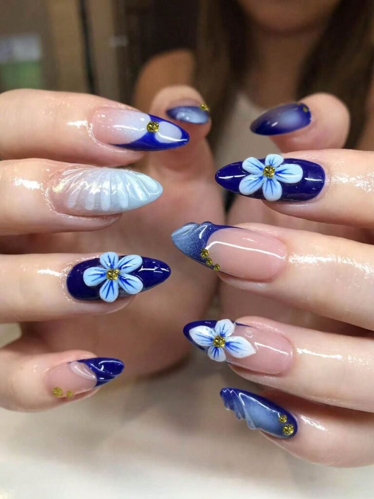 A stunning combination of deep blue and white with subtle floral accents. These nails exude a cool, calm vibe, perfect for someone seeking a refined and sophisticated appearance.