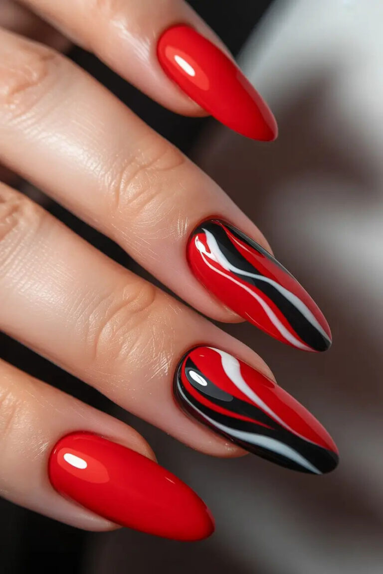 This design showcases a bold, glossy red with dramatic black and white swirls. These long almond nails are perfect for someone who wants a striking, modern, and bold look that makes a statement.