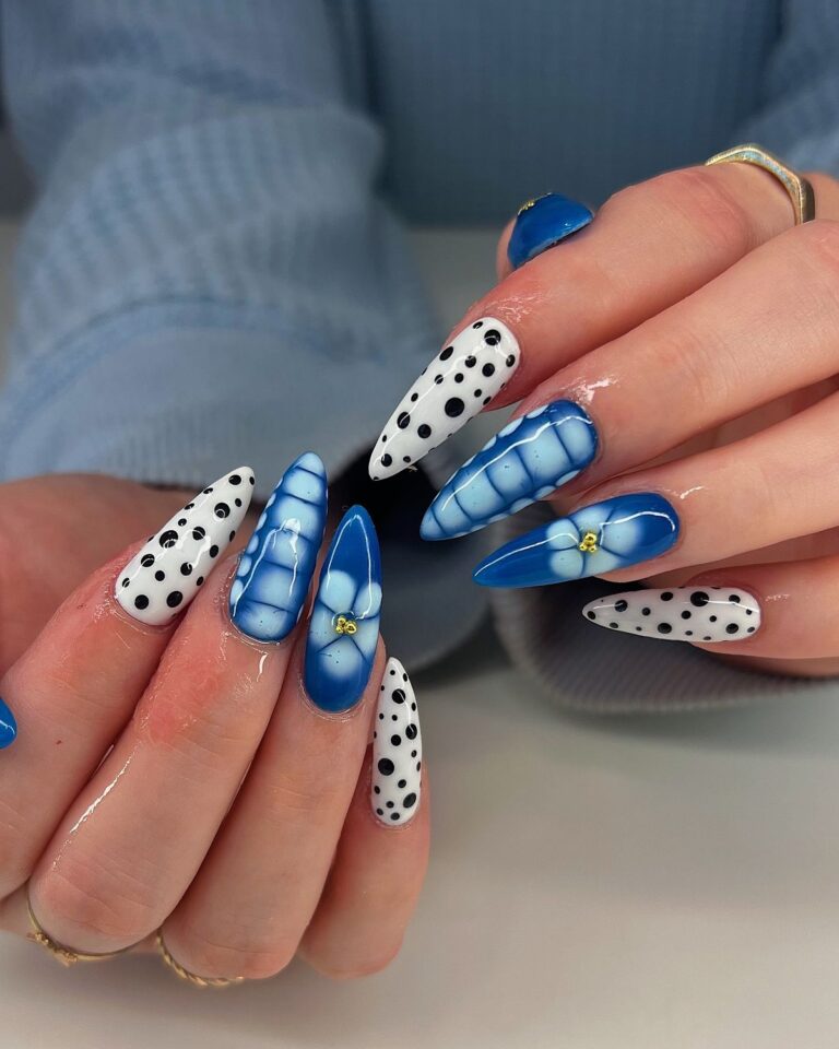 Shades of blue dominate these almond-shaped nails, with a striking ombré effect and unique nail art. The combination of bold blue tones and delicate detailing brings a cool, serene vibe perfect for any occasion.