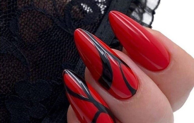 A mix of deep red and black on long almond-shaped nails gives off an intense vibe. The addition of glossy, sharp curves creates a dramatic effect, making it perfect for those who want to go for a daring and fashionable design.