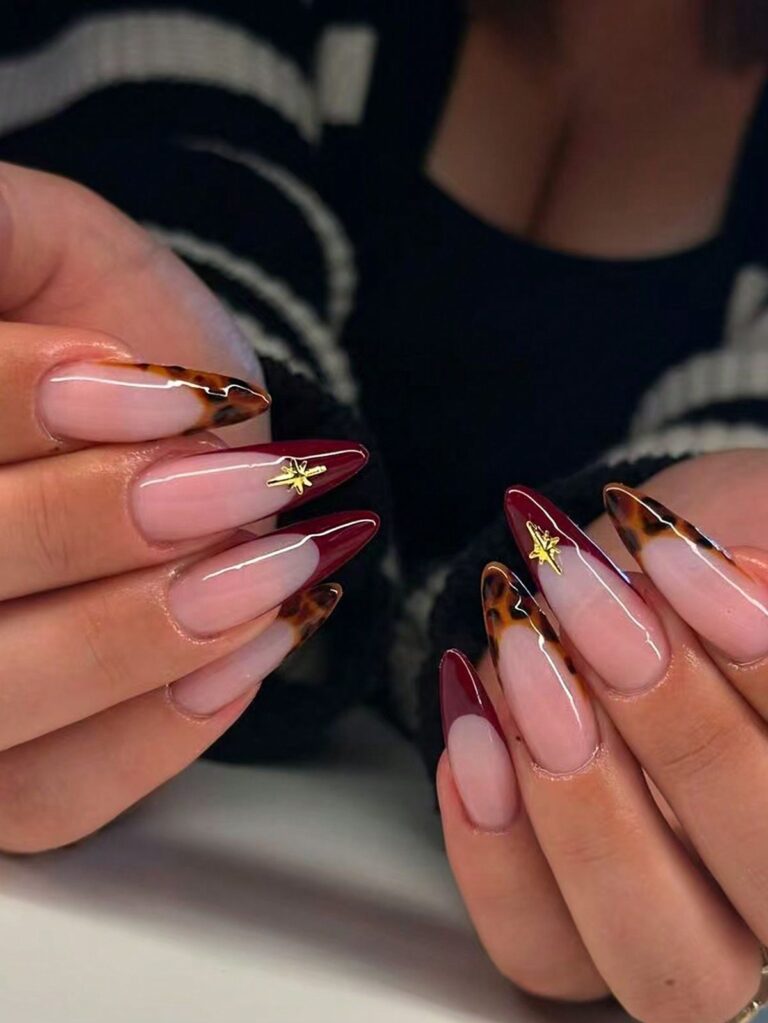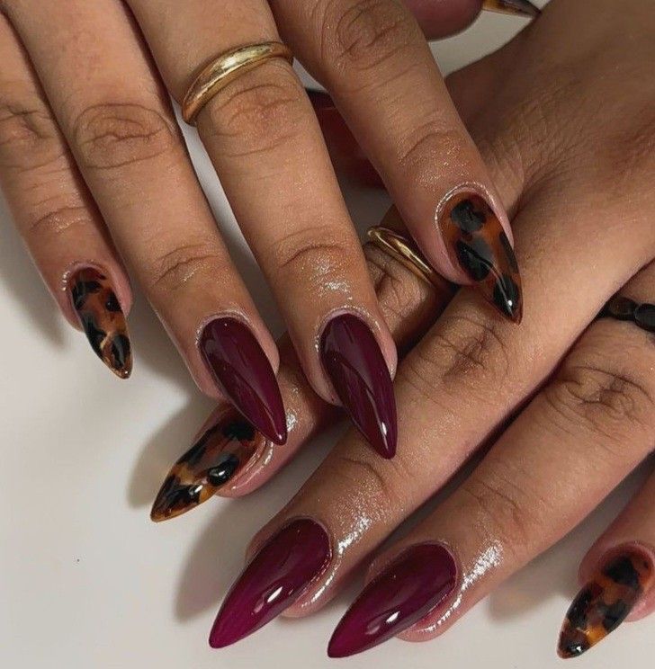 Featuring deep burgundy and tortoiseshell patterns, these nails are the epitome of autumn elegance. The almond shape pairs beautifully with the rich, warm tones of the design, making them perfect for a luxurious, earthy look.