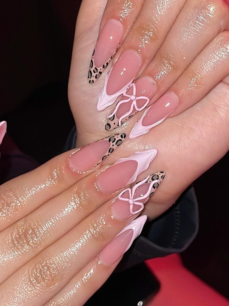 With a nude base and a hint of leopard print near the tips, these long almond nails stand out with added pearl embellishments. The combination of the wild leopard spots and the delicate pearls makes for a sophisticated yet edgy look.
