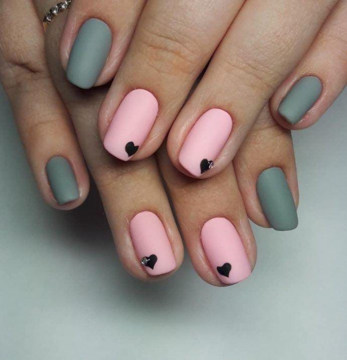 Soft matte pink and muted sage green nails are balanced with tiny black heart accents. This design feels cozy, trendy, and understated while still keeping the Valentine theme.