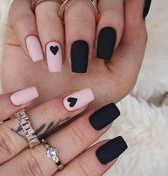 This design features matte black and soft blush pink nails with simple heart accents for a chic Valentine contrast. The overall vibe is modern, romantic, and slightly edgy.