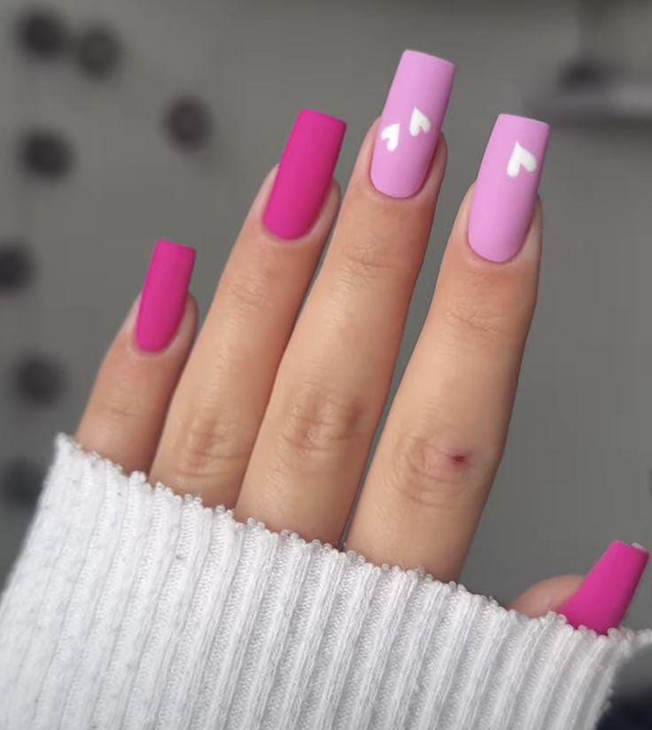 This design blends deep and bright matte pink shades for contrast. Soft heart details and a patterned accent nail create a cozy, affectionate Valentine’s vibe.