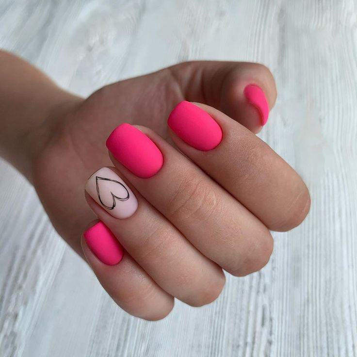 Vibrant matte hot pink nails are balanced with a nude accent nail featuring a simple heart outline. The overall feel is fun, trendy, and playful with a modern Valentine twist.