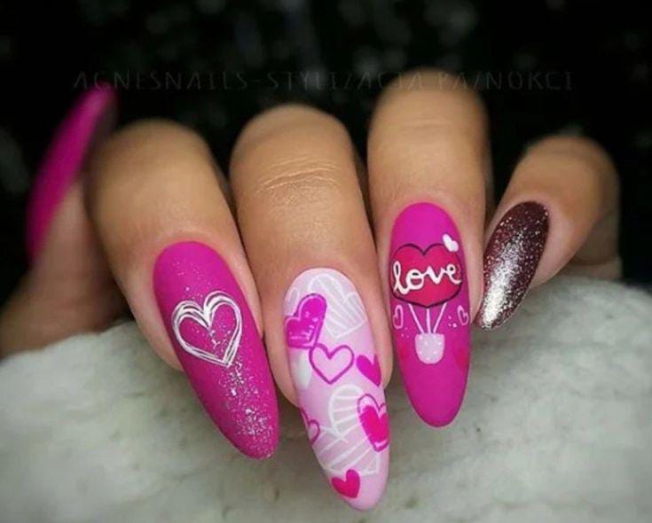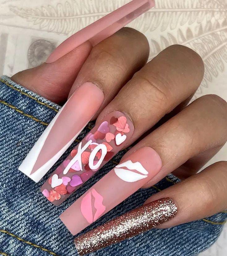 This design blends matte hot pink, soft blush, and deep glitter accents with heart and love-themed art. It has a bold, expressive Valentine vibe with a fun mix of textures and tones.