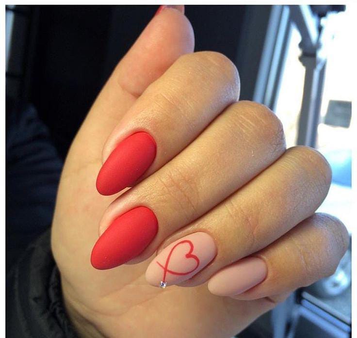 Matte red and nude nails create a clean, modern Valentine look with a subtle heart outline accent. The design feels classy, romantic, and effortlessly stylish.