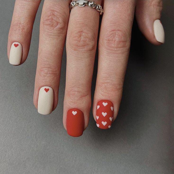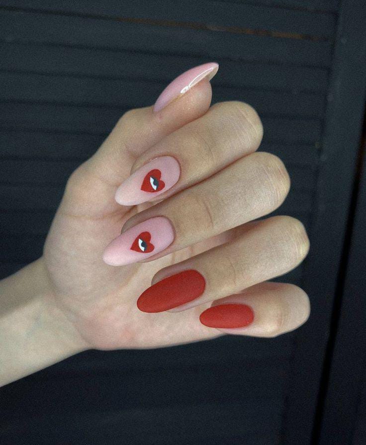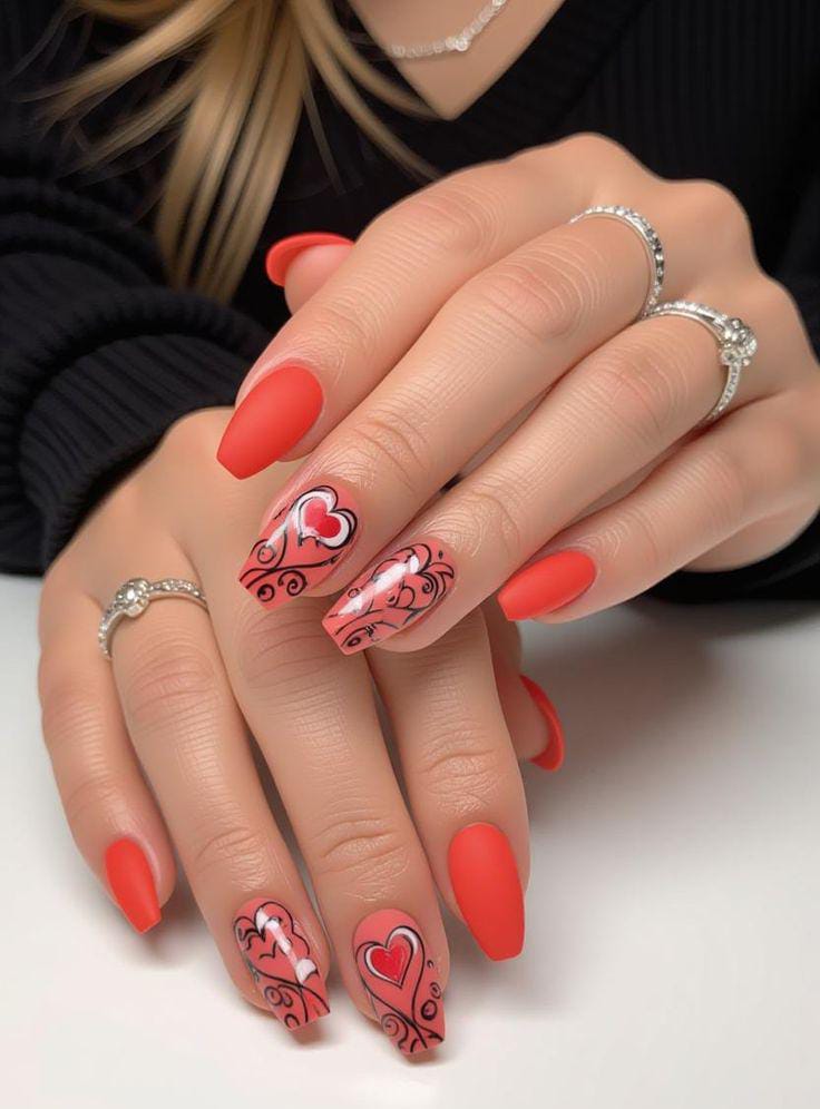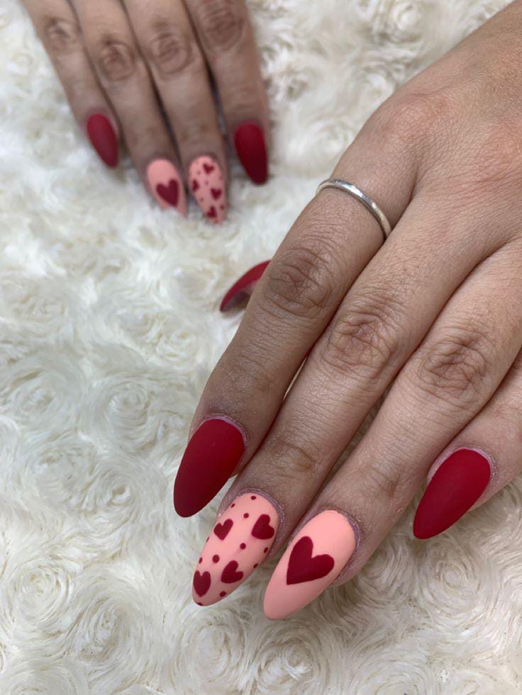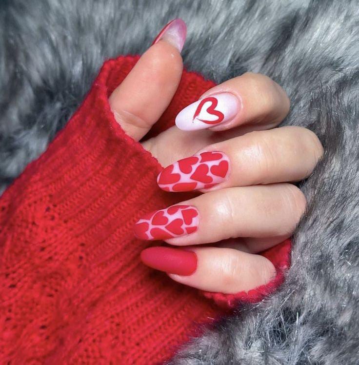 Matte red and pale pink nails are combined with scattered heart details for a playful Valentine look. It feels bold, flirty, and full of love without being overdone.