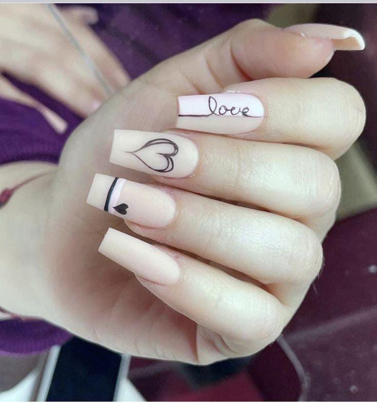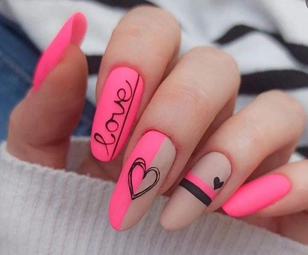 Bright matte pink and nude nails are styled with sleek black lines, hearts, and handwritten love details. The design feels trendy, artistic, and playful with a modern Valentine twist.