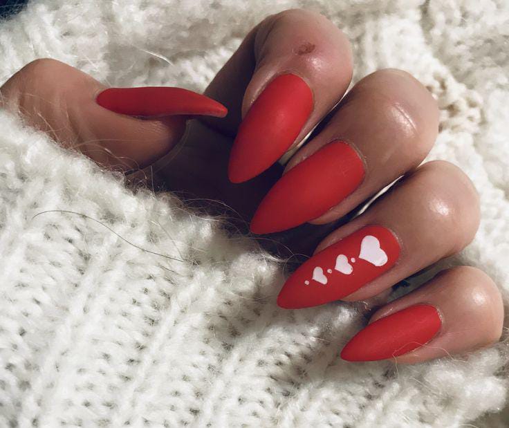 Matte red nails with small white heart accents create a timeless Valentine aesthetic. The look is elegant, bold, and effortlessly romantic.
