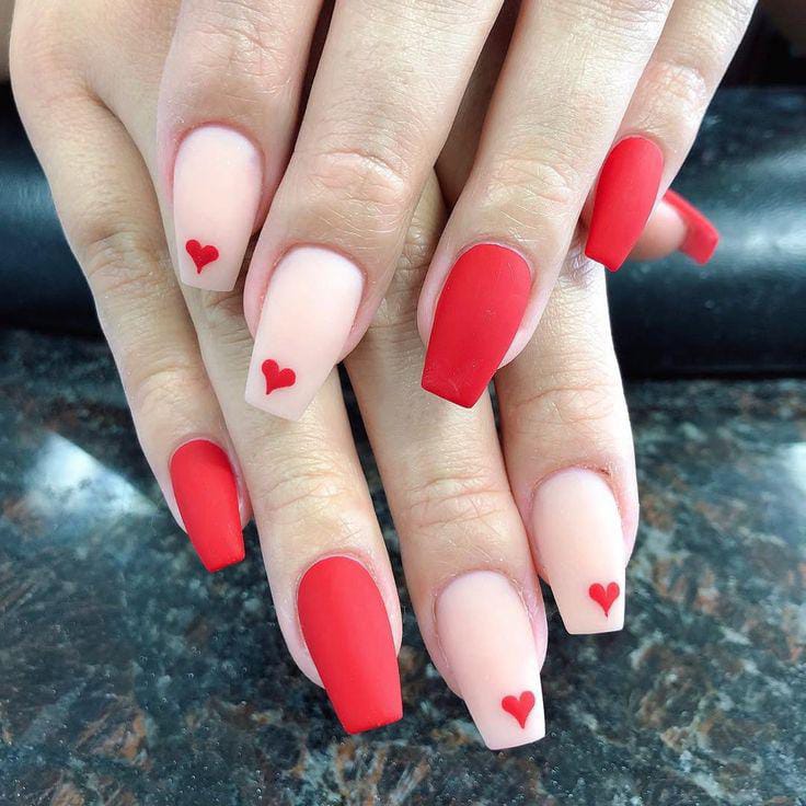 Soft nude and bold red matte nails alternate for a clean Valentine look. Tiny heart accents keep the design simple, romantic, and timeless.