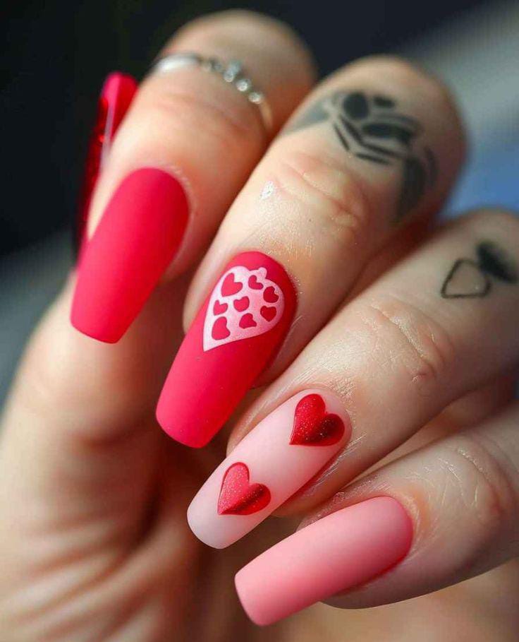 Matte red and pink nails are paired with heart patterns and glitter heart accents. The style feels bold, glamorous, and perfect for a statement Valentine manicure.