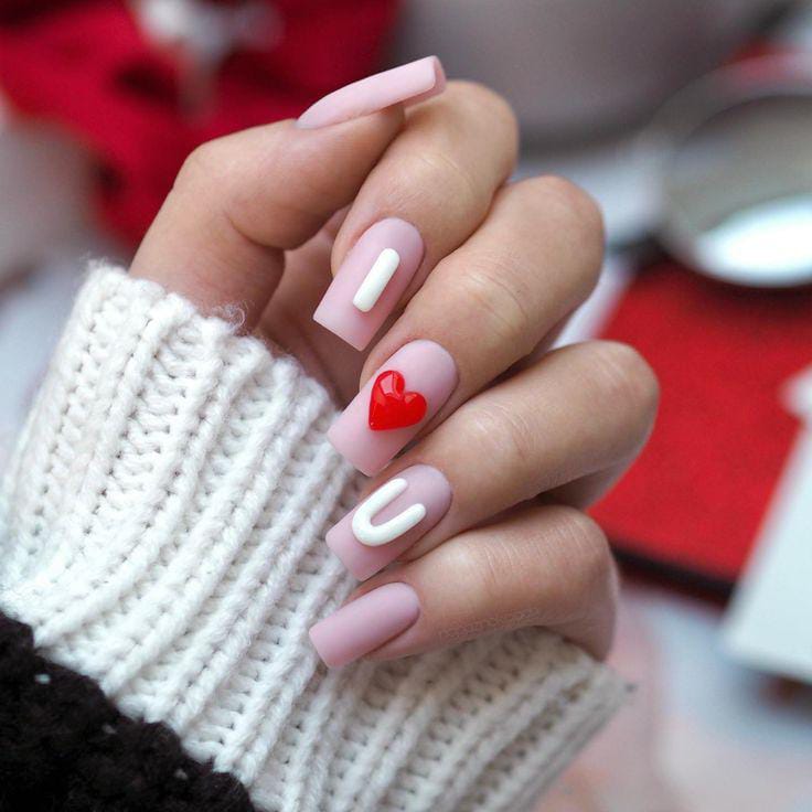 Muted pink matte nails feature subtle 3D white “I” and “U” letters with a red 3D heart between. The design feels modern, soft, and effortlessly romantic Valentines.