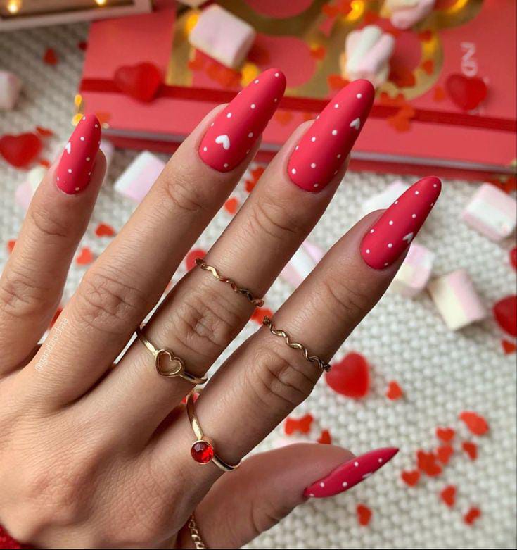 Matte red and white nails are decorated with tiny hearts and polka dots for a candy-inspired effect. This design feels classic, bold, and full of Valentine energy.