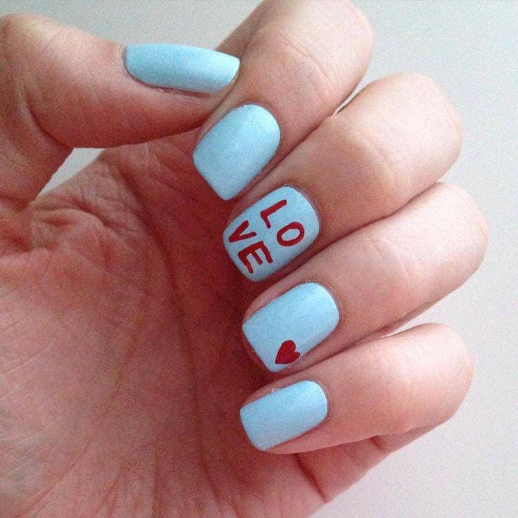 Soft baby-blue matte nails give a clean and playful look, accented with tiny red hearts and a handwritten “love” detail. The design feels minimal, cute, and lighthearted Valentine’s look.