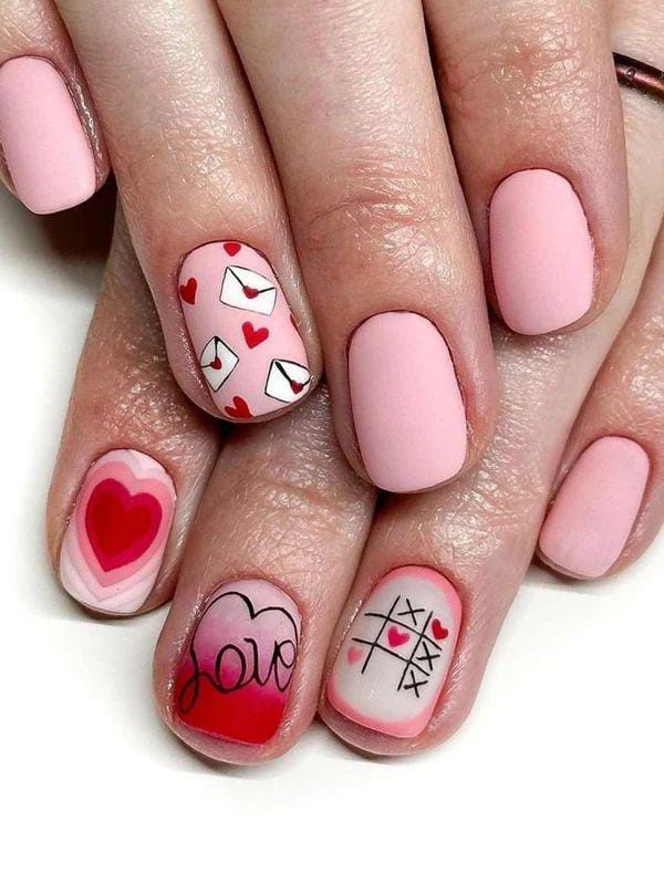 Matte pink nails are paired with hearts, envelopes, and love-themed doodles for a romantic Valentine’s vibe. The mix of soft tones and playful patterns makes it charming and cozy.