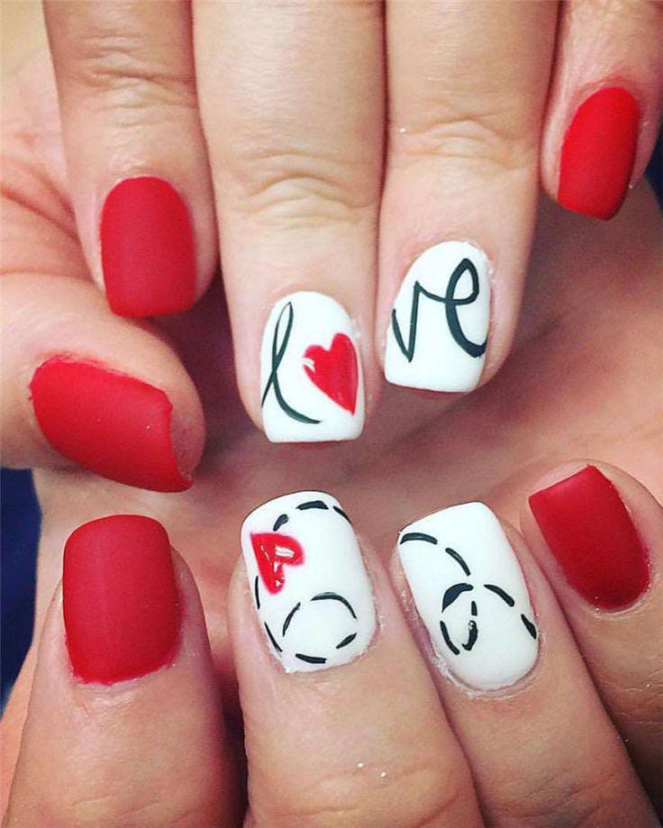 Bold matte red nails are balanced with white accent nails featuring simple love lettering and heart shapes. The contrast creates a classic yet modern Valentine’s look.
