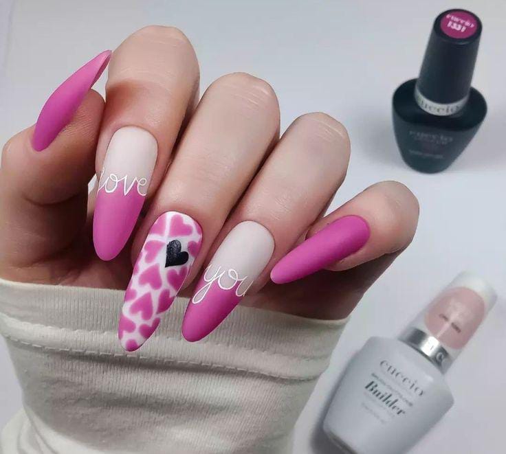 A bold matte pink and nude combination is highlighted with heart patterns and minimal love lettering. The look is stylish, trendy, and slightly edgy while staying romantic Valentines.