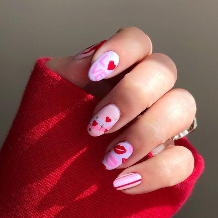 A bold matte red base mixed with pink accents and repeating heart patterns creates a statement look. The overall style is playful, confident, and very Valentine-forward.