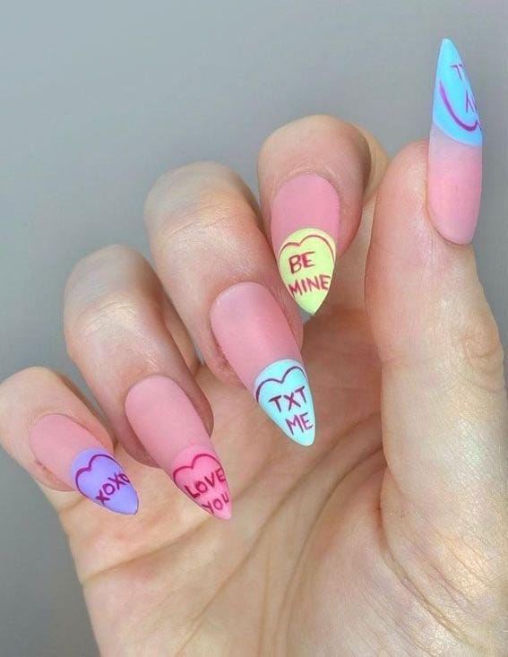 Pastel matte nails showcase cute candy-heart messages in soft colors. This look is fun, nostalgic, and inspired by classic Valentine sweets.