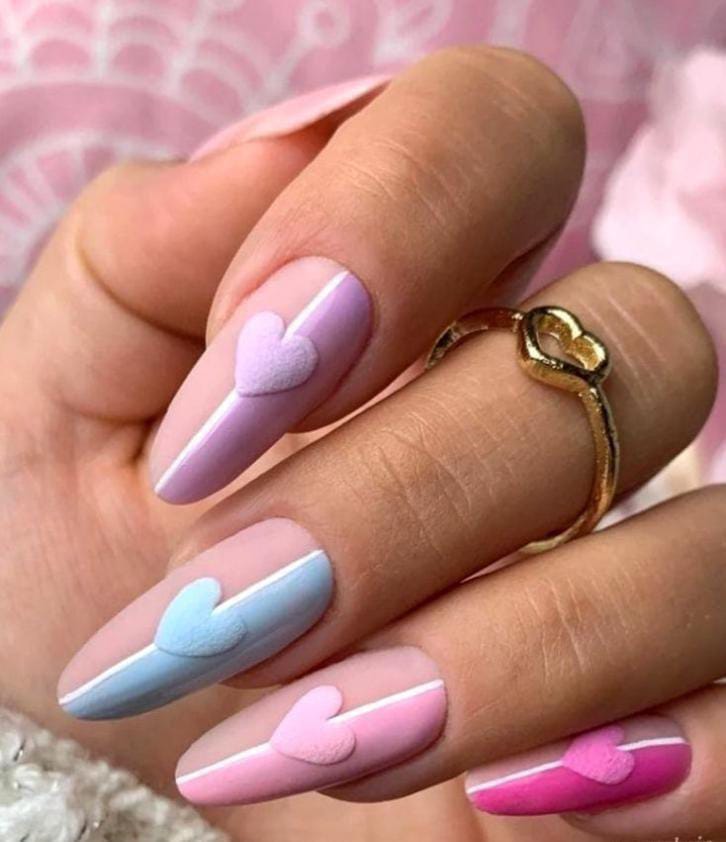 Soft matte pastel shades like pink, lilac, and baby blue create a sweet Valentine look. Raised heart accents add a cute, playful texture without feeling too busy.