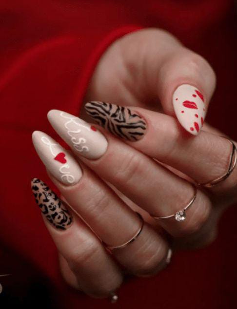Matte neutrals mixed with black animal prints and tiny red heart details mixed with “love” and “kiss” letterings. It feels modern, edgy, and perfect for statement Valentine nails.