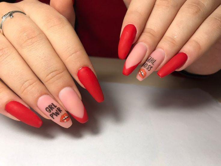 Classic matte red nails are paired with soft pink accents and minimal text-style art and lip print. The look is edgy yet romantic, balancing bold color with modern Valentine flair.
