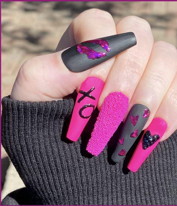 Matte black and hot pink nails blend with glitter accents and heart details for a dramatic look. The contrast gives a bold, edgy Valentine vibe with a modern finish.