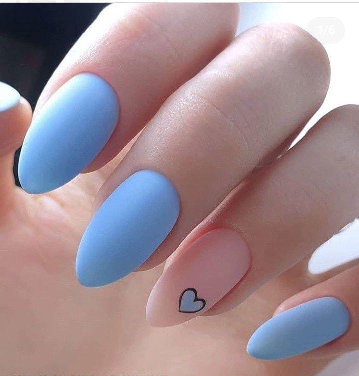 Matte baby blue nails are paired with a nude accent nail and a tiny heart for a clean, modern feel. The look is calm, airy, and effortlessly cute with a romantic Valentine’s touch.