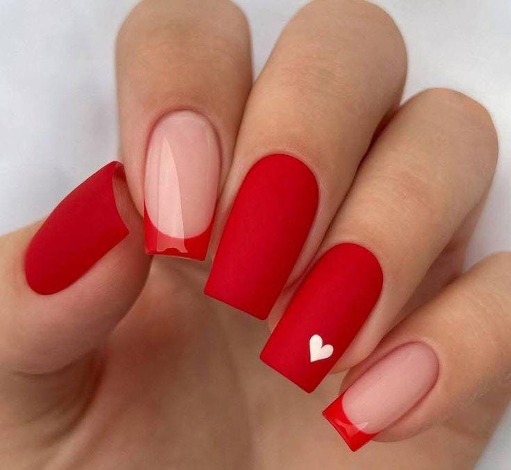 Bold matte red nails are mixed with glossy red french tips and a small heart detail for contrast. The style feels classic, confident, and unmistakably Valentine-inspired.