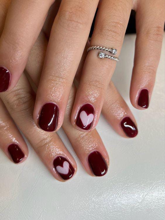 Muted pink and deep red nails are paired with tiny heart details for a minimal Valentine touch. It looks neat, polished, and effortlessly cute.