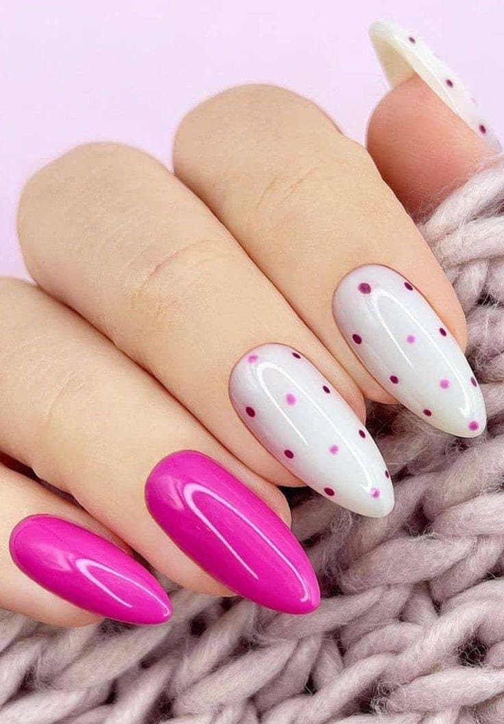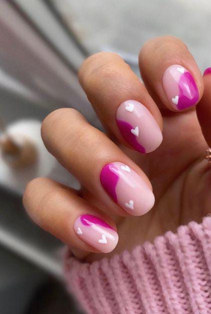Bright pink accent nails are paired with milky white nails dotted in soft pink tones. The design feels fun, light, and still clean enough for a minimal Valentine aesthetic.
