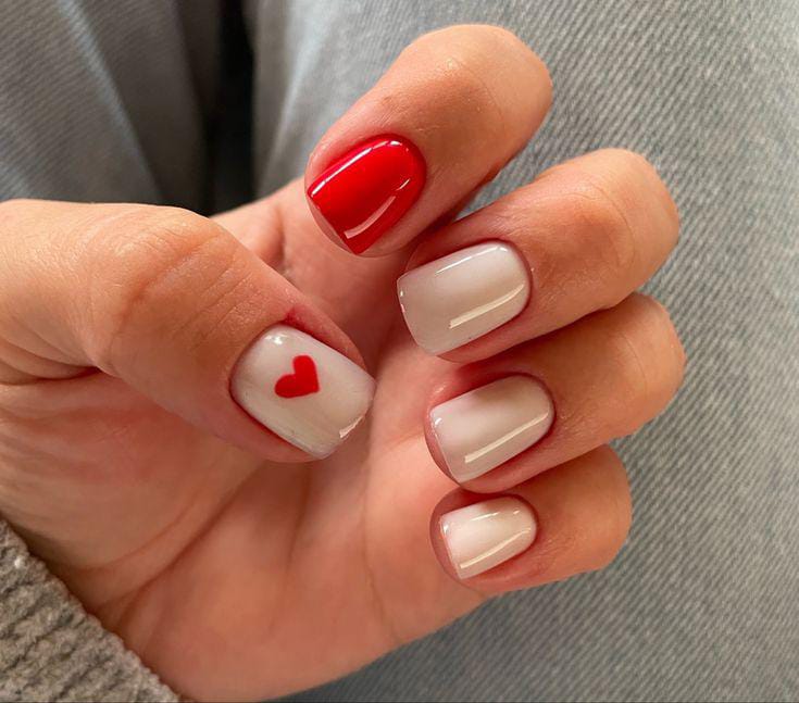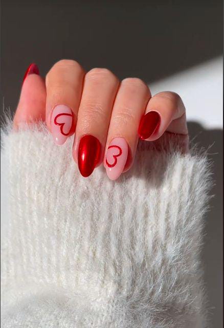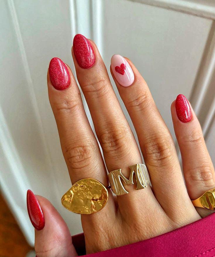 A mix of solid red nails and soft pink accents with a single heart detail. The contrast adds a bold yet minimal Valentine vibe.