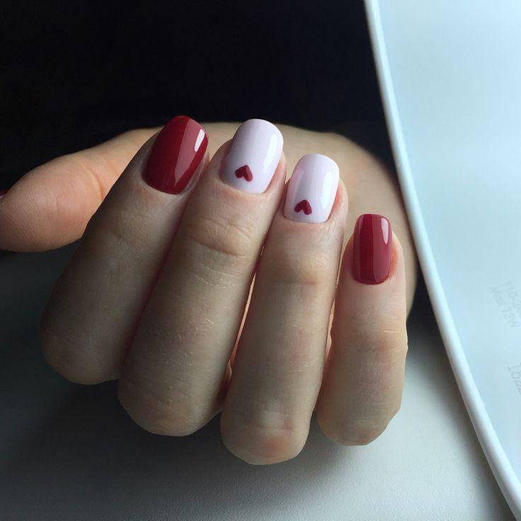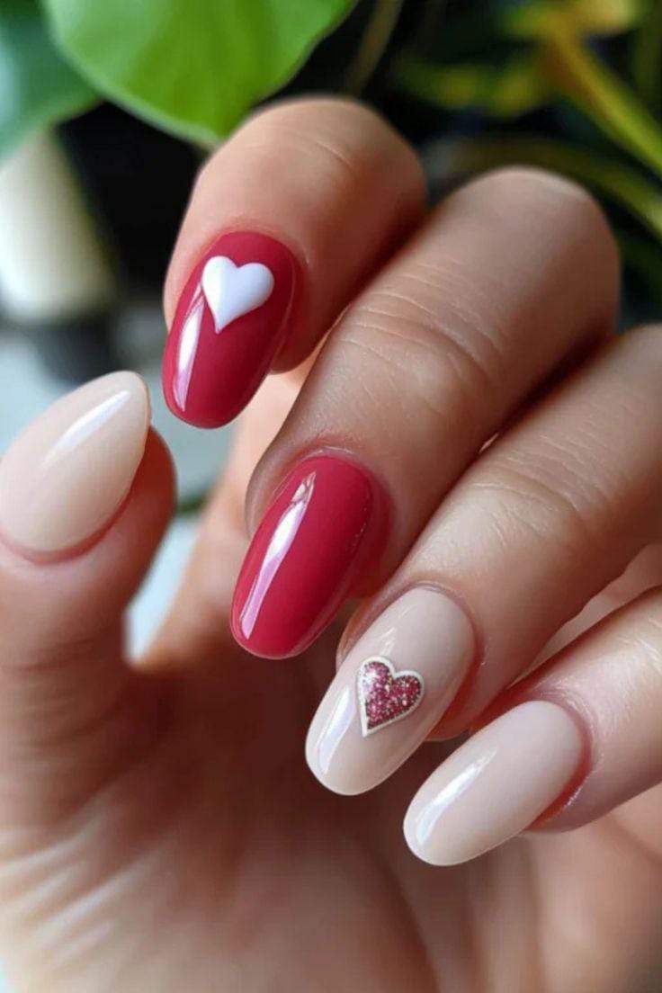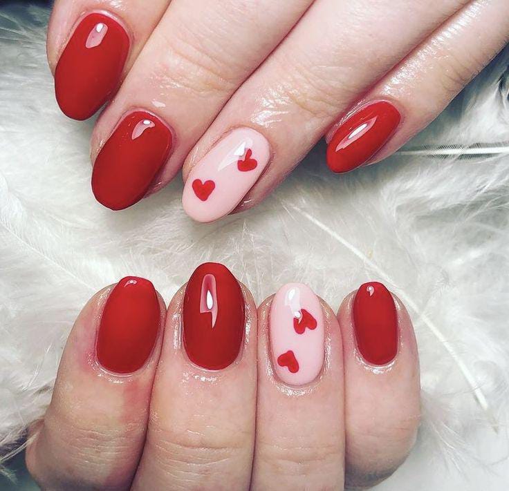 Deep red nails are balanced with nude accent nails featuring tiny red hearts. The contrast keeps the design bold yet simple and very minimal Valentines.