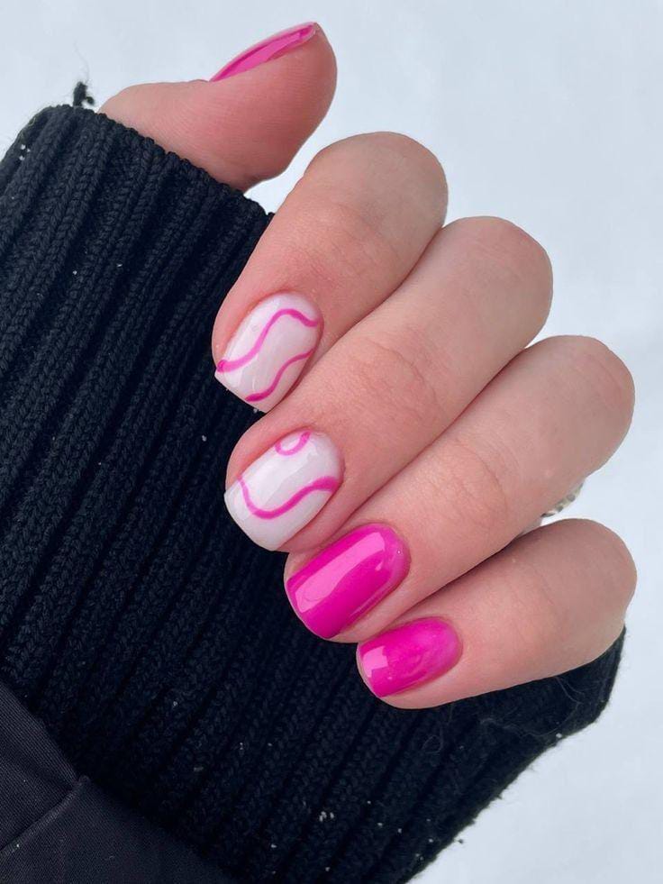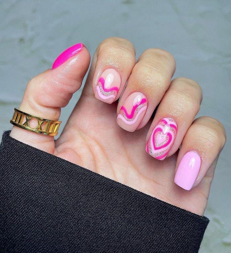 A mix of bright pink and sheer nude nails is finished with flowing pink line art. The design feels modern, artistic, and subtly Valentine-inspired.