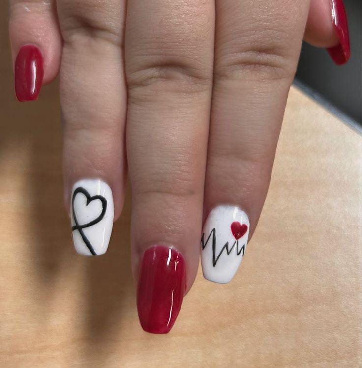 Classic red and white nails are combined with simple heart and heartbeat line art. The look is clean, meaningful, and timeless Valentine’s look.