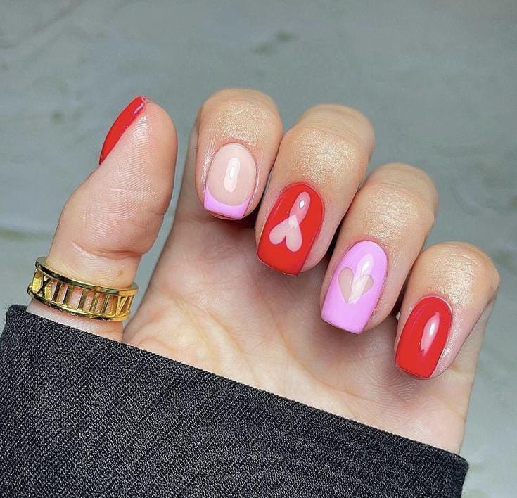 This design mixes glossy red nails with soft pink ones, finished with small heart details. The contrast gives a minimal yet clean Valentine’s Day look.