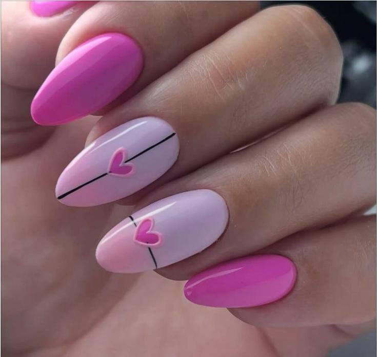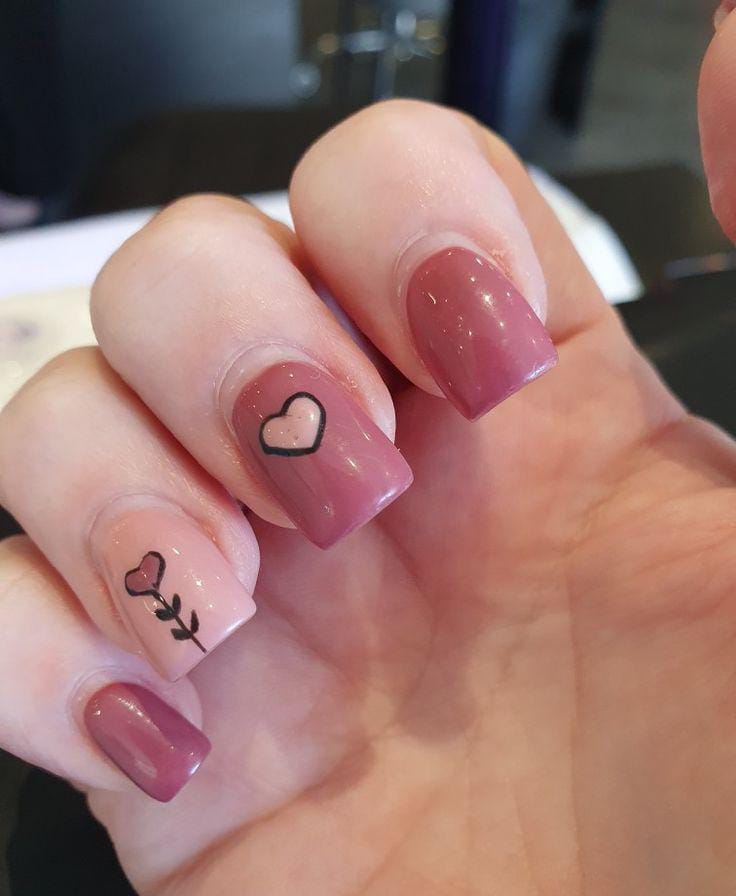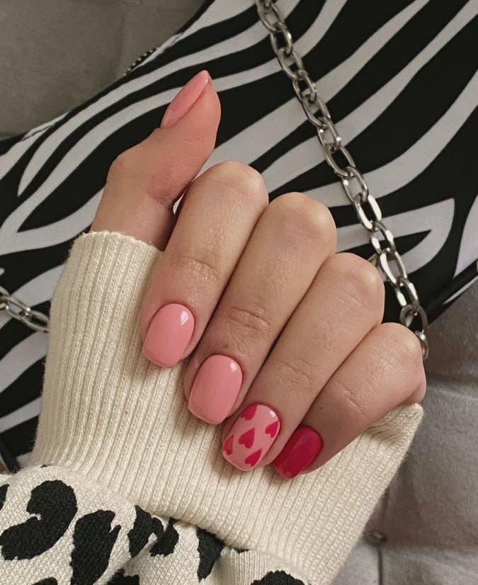 This design combines bright mauve and nude nails with simple heart details. The contrast keeps it elegant while still feeling playful and Valentine-ready.