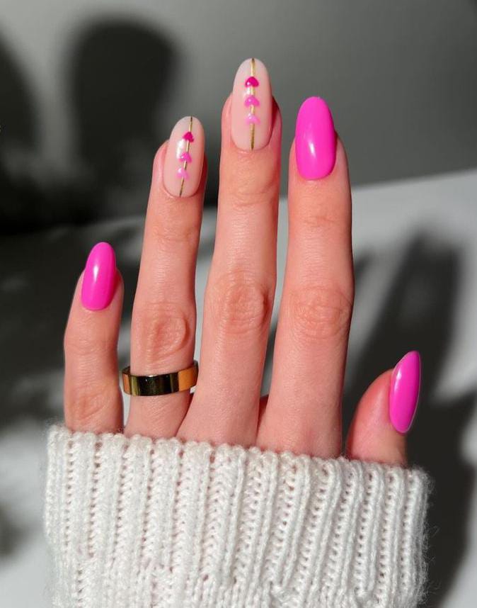 Bright pink nails are paired with nude accents featuring small hearts aligned like a stem. The contrast feels fresh, feminine, and perfect for a minimalist Valentine style.